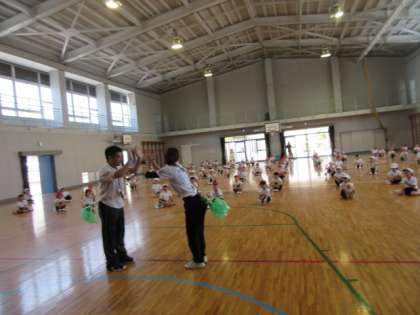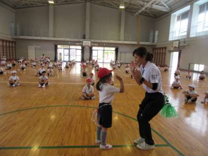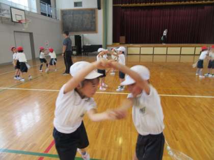 2本のペットボトルをつなぐゴムひもを腰にまくと,ペットボトルがあざらしのしっぽのようにゆれて,かわいいです。