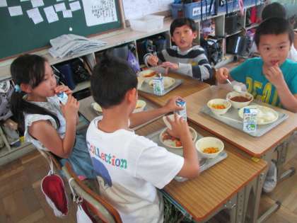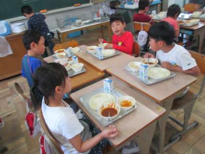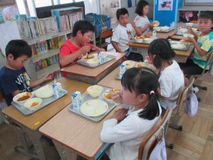 給食のメニューはハヤシライスでした。練習でおなかペコペコなので,みんな無言で食べていました。