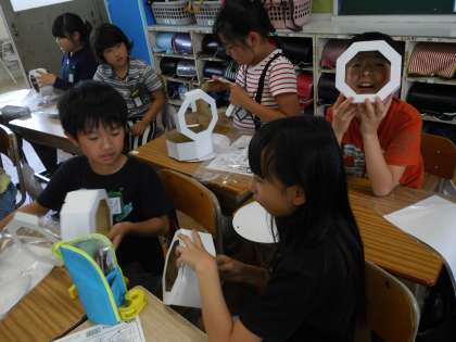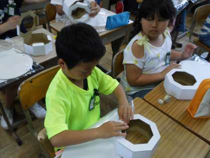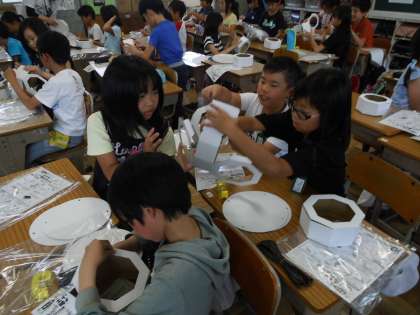 体育大会本番で使用する「エイサー締め太鼓」を作りました。台紙を組み立てて,ひもを通して締めています。次回に,太鼓の面に模様を描いて完成です。