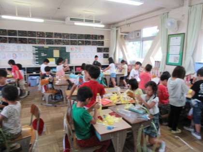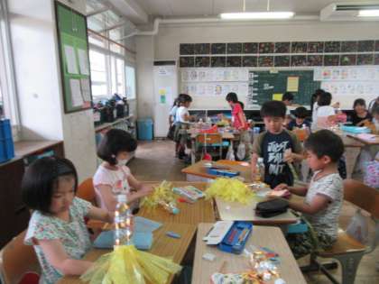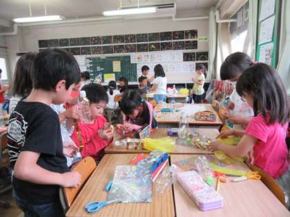 ペットボトルにキラキラテープを巻いたり,すずらんテープをペットボトルの高さに切って,両面テープに18本貼り付けたりと自分たちでがんばっています。