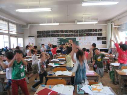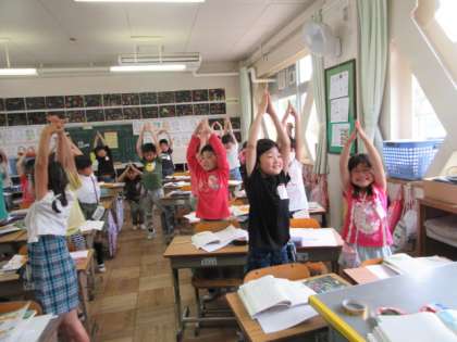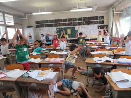 倒れていた花の軸が,また起き上がって,ぐんぐん背を高くする場面を動作化して,理由を考えました。