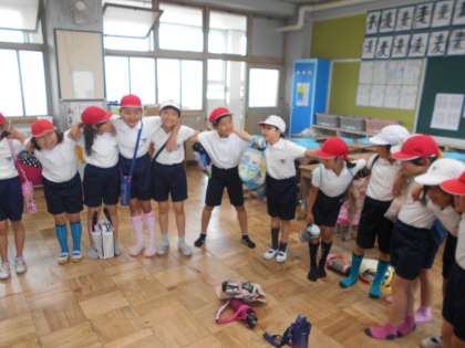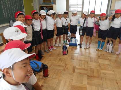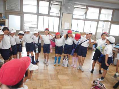 いよいよ体育大会当日です。教室で円陣を組んで,気合いを注入します。