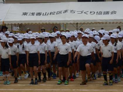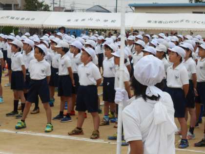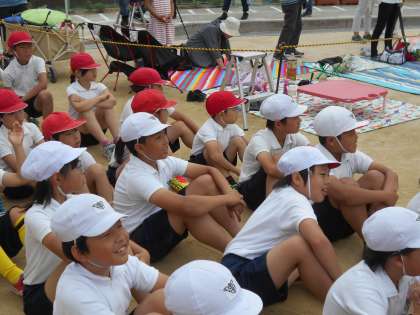 開会式の様子です。元気いっぱい「体育大会の歌」を歌いました。