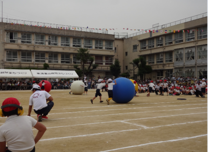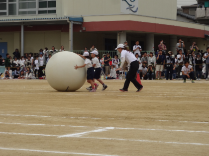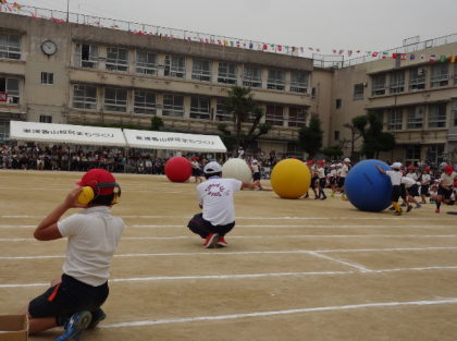 大玉転がしです。友だちと協力して転がしました。スピードがはやいペア、ゆっくり正確にころがすペア、声をかけ合うペア。みんなそれぞれによく頑張りました!