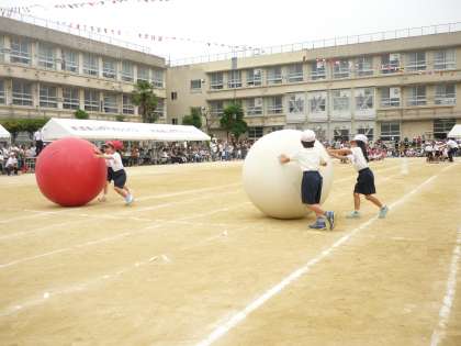 大きな球を二人で協力して転がしています。がんばれ!