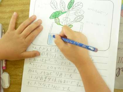 野菜の観察をしました。すくすくと育っています。よく色をみると,一色だけではないようです。細かいところまで観察していました。