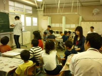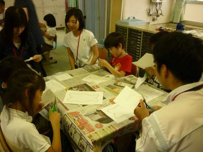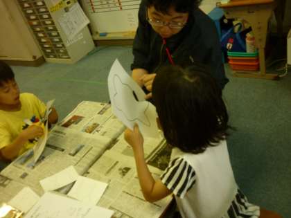 ゲームが終わると、先生たちと一緒に糸で登るかたつむりを制作しました。はさみやテープ、さまざまな道具と材料を使ってそれぞれのかたつむりができていきます。「切るのが上手だね!」とほめてもらっていました。