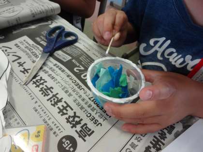 好きな色の画用紙を入れて、いろいろな色のかたつむりになりました。