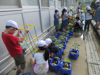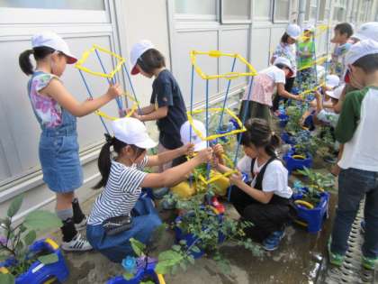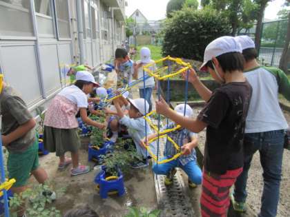 野菜の苗がぐんぐん大きくなり,支柱を立てる人も出てきました。