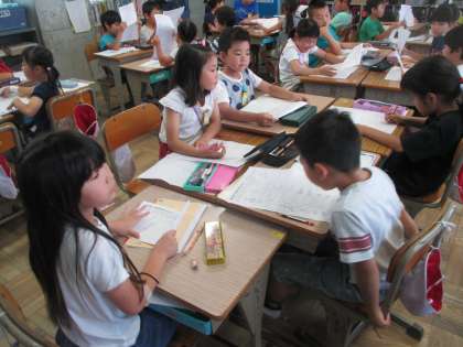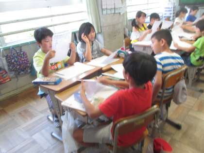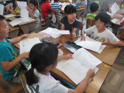 土日に調べてきた気になる記号について,みんなで見せ合いをしました。道路に家に,商品に記号はあふれています。
