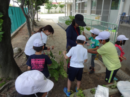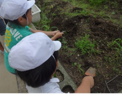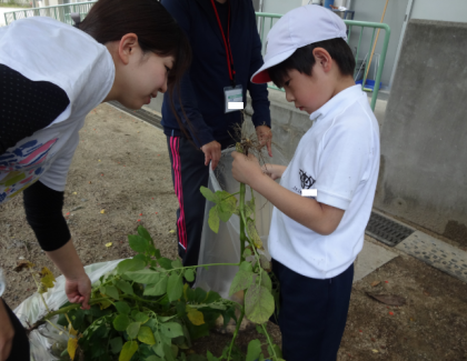袋に、葉と芋を分けて集めました。「茎はなくなったけど、土の下に埋もれているかもしれないから、みんなで探そう!」と先生が言うと、スコップを持ってやる気いっぱいに探していました。