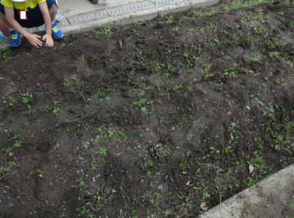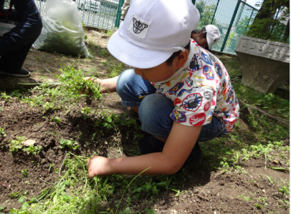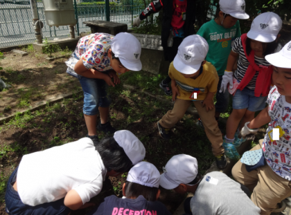 途中は出てきた虫に群がり、「え〜見せて!」「どこどこ?」「何の虫かな?」と大発見の瞬間もありました。雑草が多かった畑はみんなで草抜きをして、すっきりです!