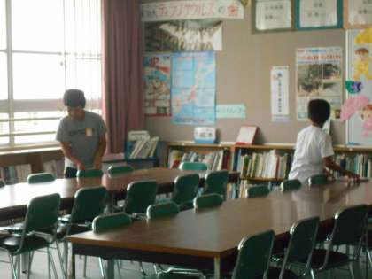 図書の最後に、図書係さんがイスが並んでいるかチェックしています。