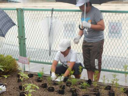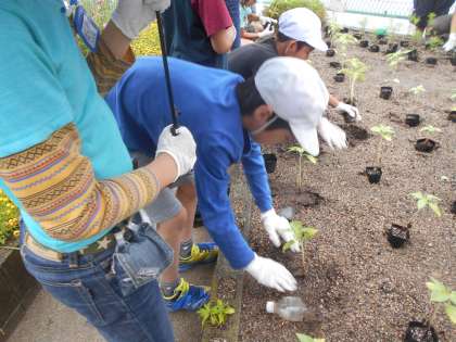 栽培委員会では、先月にポットに種をまいたヒマワリとコスモスの苗を花壇に植えました。
