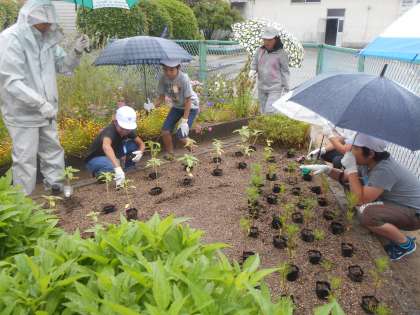 栽培委員会では、ヒマワリとコスモスの苗をみんなで植えました。
