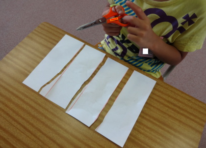 はさみの練習です。今日は全て自分で切ることができました!!!真っ直ぐ切れている部分もあり、上手になってきています。