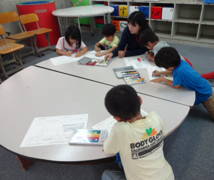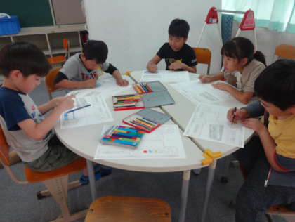 工作では、電車をつくりました。紙に色を塗って、線に沿って切り取り、折って組み立ててます。