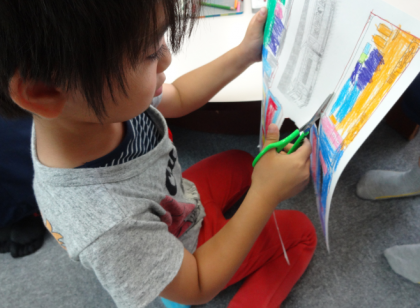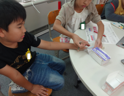 「のりしろ」があるので、気を付けて糊付けします。立体に組み立てる時は、上級生が下級生に優しく手を添えて教えていました。