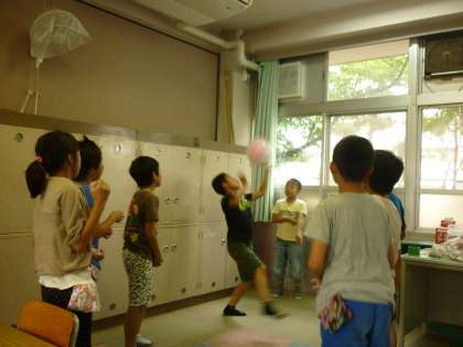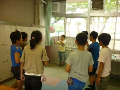 昼休みに5年生と4年生で遊んでいます。みんなで楽しく遊べるような提案をしてくれ、全員がボールに触ることができました。さすが5年生です。