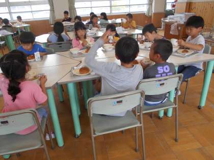ランチルームで給食を食べました。班の友だちと話が盛り上がり楽しく食べました。