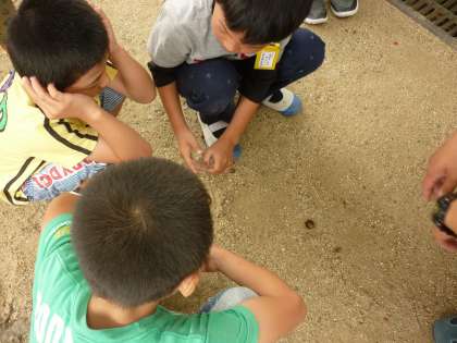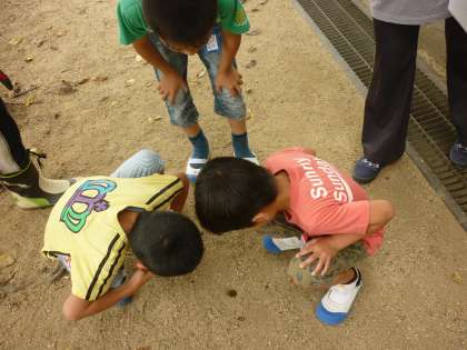 学校校務員さんが、休み時間に「穴の中にセミがいるよ!」と教えてくれました。みんなで見に行くと、本当に土の中でセミが動いていました。なかなか見れないものだそうです。貴重な体験に、みんな興味津々で見ていました。