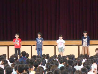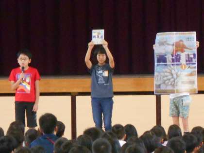 児童集会では、ベルマーク委員会や図書委員会からのお知らせがありました。