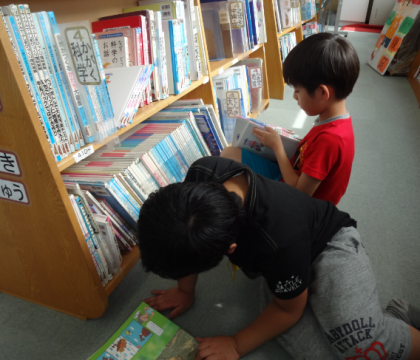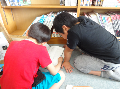 百科事典で索引を使って調べ学習をしました。「ねぇ、○○くん。『アーモンド』って調べて!」「1巻の132ページだ!写真ものってるね。次は僕の番だよ、僕が言ったものを調べてね!」と、交互に単語を出して調べ合っていました。「百科事典にはなんでものってるね〜!」と、驚いていました。図書館見学も楽しみです!