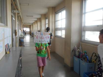 休み時間に生活委員会が正しい廊下の歩き方を呼び掛けています。