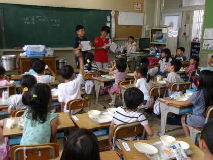 給食委員会では、給食目標と、配膳のしかたについて知らせに行きました。
