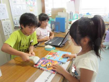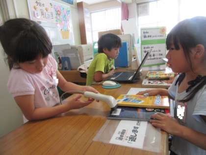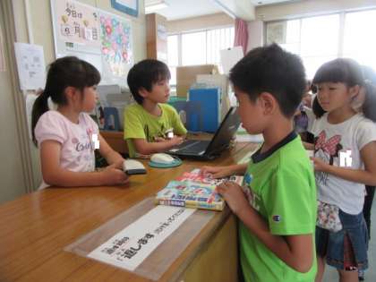 図書係の人たちが,バーコードを読み取って本を返す仕事をがんばっています。