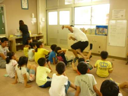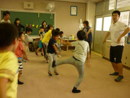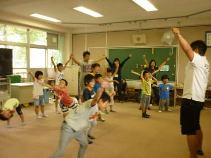 今日からなかよしタイムで「妖怪体操第一」をします。先生のお手本を見てから、みんなで音楽に合わせて体を動かしました。