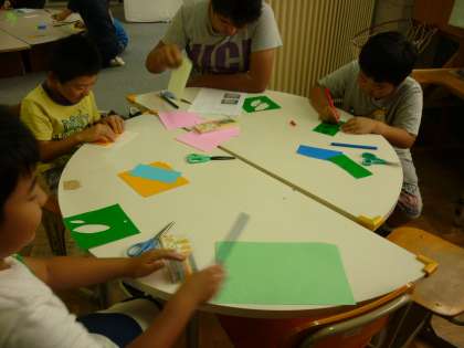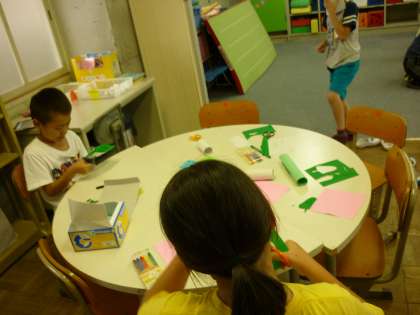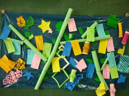 「たなばた」の歌を歌ったあとは、みんなで短冊に願いごとを書いたり、七夕飾りを作ったりしました。みんなの願いごとが叶うといいですね。