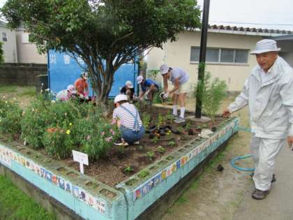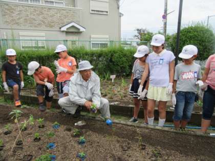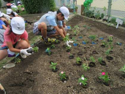 自分たちでデザインした花壇に,種から育てていただいた花のポット苗を植え替えました。
