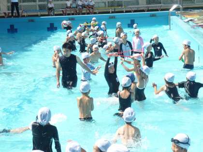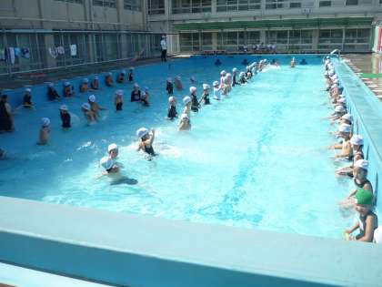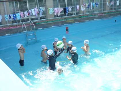 今学期最後のプールでした。ボールや輪くぐりなどの活動をしました。