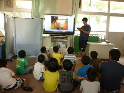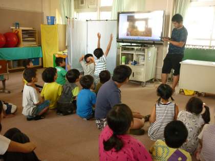 楽しかったことで意見も多かった、合同レクレーション大会の写真を見て振り返りをしました。友だちが写っているとその子に声をかけたり、自分が写っていると照れくさそうにしたりしていました。