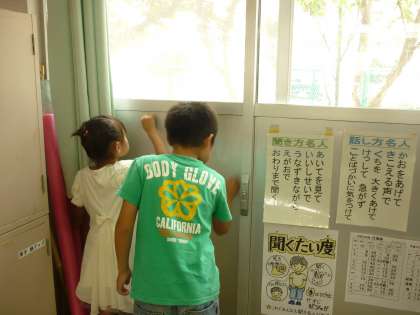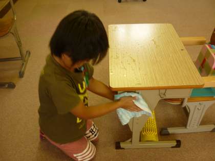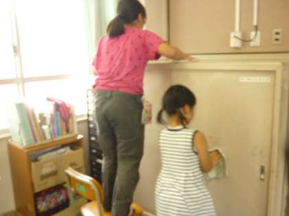 振り返りのあとは、一学期中自分たちが使った教室をきれいにしました。高学年の子が低学年の友だちに、掃除の仕方を優しく教えてくれていました。