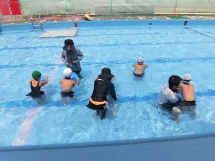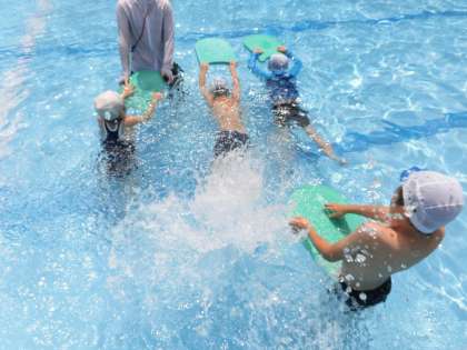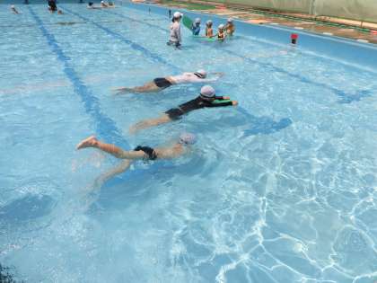 なかよしプールの様子です。コースに分かれて、ビート版を使って泳いだり、バタ足の練習をしたりしました。雨で中止が続き、久しぶりのプールにみんなテンションアップでした。