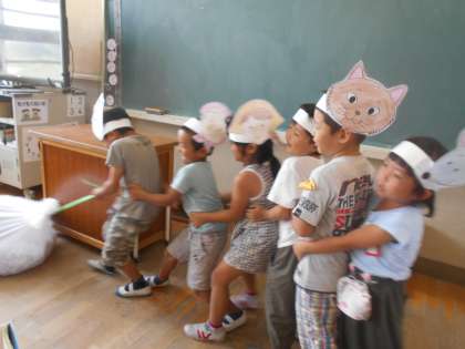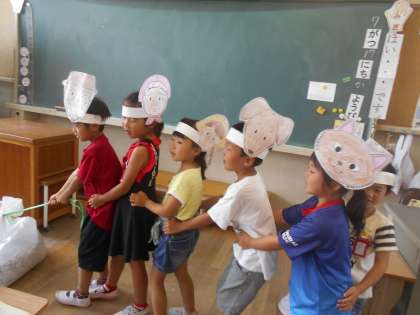 「おおきなかぶ」の音読発表劇をしました。声をそろえて大きなかぶをひっぱります。