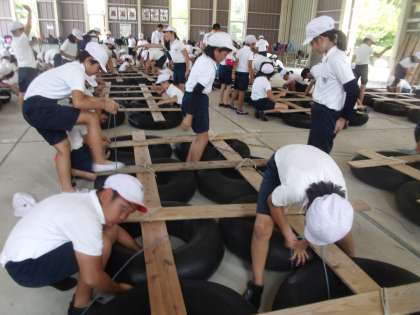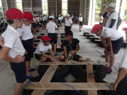 いかだを協力して組み立てています。
