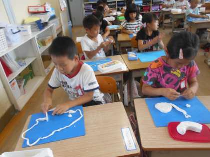 ひもひも粘土です。細長い形でいろいろなものをつくりました。最後は1つの大きなボールをつくって片づけました。