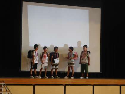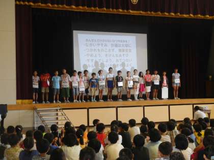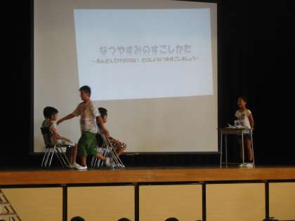 児童会より計画的に夏休みを過ごすヒントを劇で教えてもらいました。4年生の児童会も活躍しました。