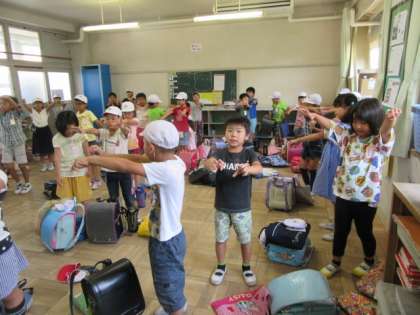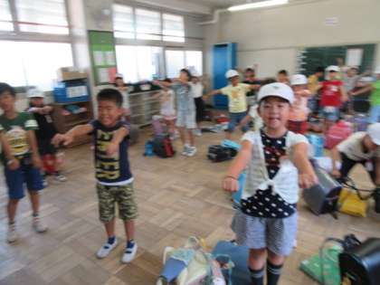 大掃除でワックスをかけるために,机を全部廊下に出しました。終わりの会で,今月の歌WANIMAの「やってみよう」を歌いながら,グーパー体操をしました。夏休みも体力作りをがんばってくださいね!