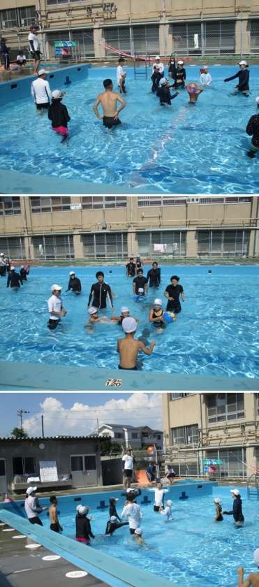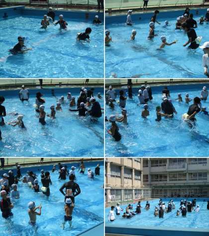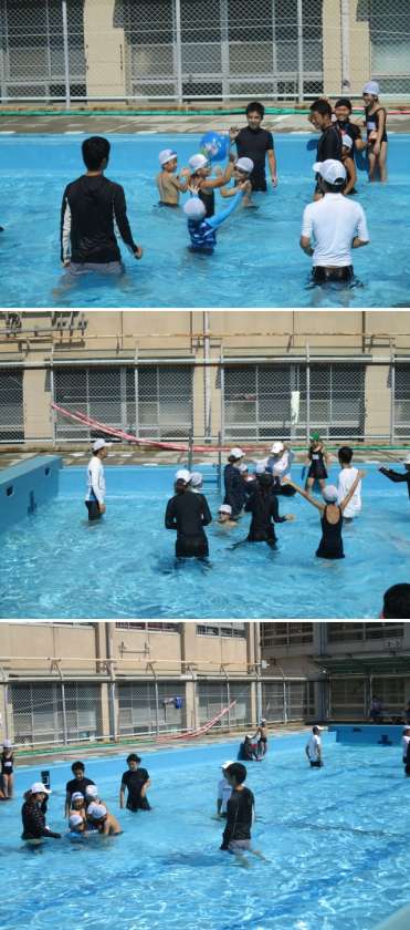 プールでは、自分たちでつくったペットボトルの水てっぽうでまとあてゲームを楽しみました。その後は、水中ポートボールをしました。