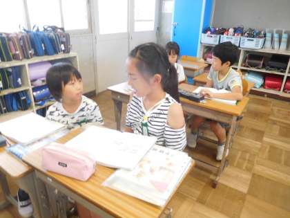 黒板に書かれた2つの考え方の違いを友達と一緒に探しました。