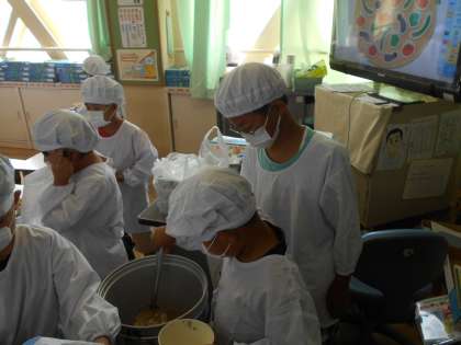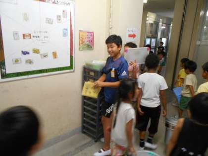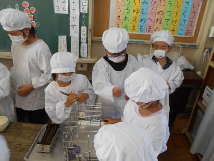 1年生も新しい当番になったので、配膳の手順や気をつけることを教えてあげています。