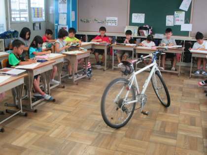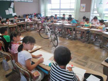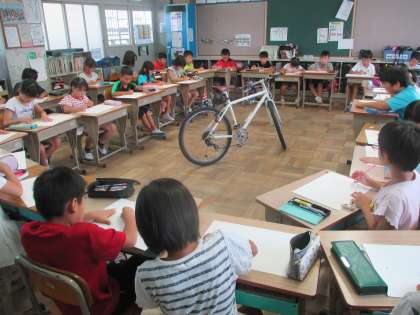 自転車の絵をみんなでスケッチしました。またがってみたり,アレンジしたり,集中してスケッチしました。
