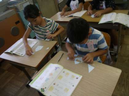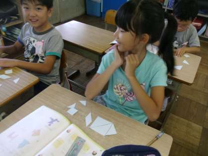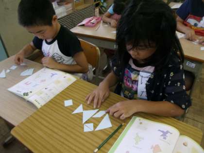 7枚の形を使って「タングラム」をしました。初めは難しい様子でしたが,コツをつかむと「できた!」と嬉しそうな表情が増えました。