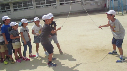 クラス全員で長縄チャレンジ再開です。目標は1分間で100回!がんばろう!!