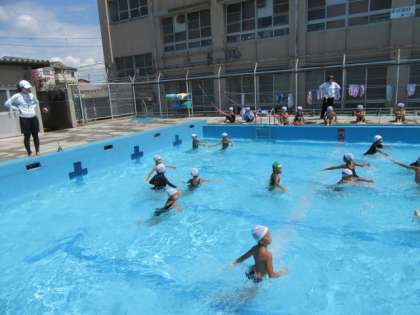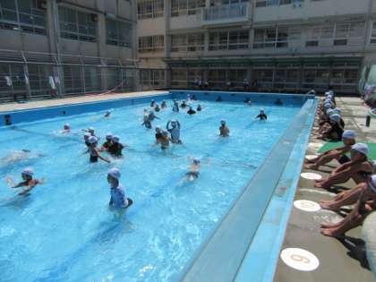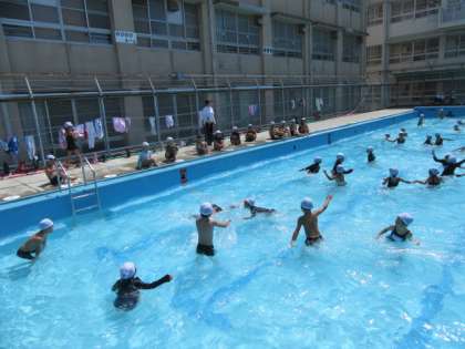 久しぶりのプールでした。だるま浮き・足の間くぐり…などの水慣れをした後,泳力テストをしました。最後に,水中おにごっこもしました。暑い日なので,水筒をプールサイドに置いて,水分補給をしながら行いました。