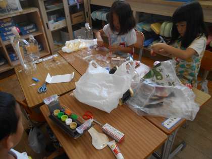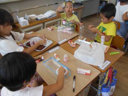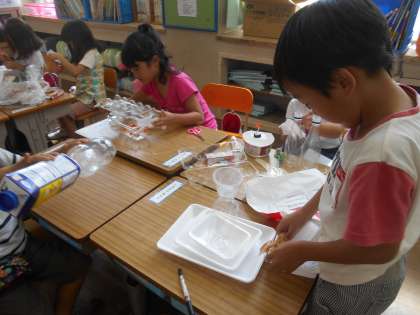 プールに浮かべる船をつくりました。明後日の水泳の授業で浮かべます。うまく浮くかな?楽しみですね。
